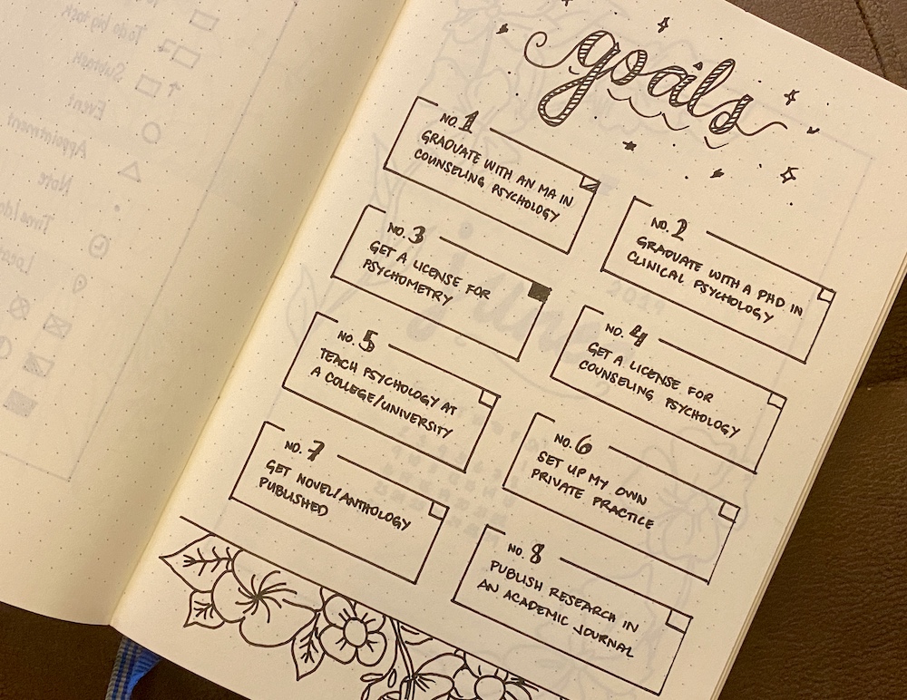 I am not the most artistic person, so I rarely draw in my bullet journal. It takes painstaking time and effort to decorate my journal with colors and aesthetics, so I stick to just one type of drawing pen, two shades of gray highlighters, and a few illustrations here and there to mark the beginning of a month, a year, or a collection. My bullet journal is also very ambition-driven, with most of my entries geared toward my academic career as a psychologist-in-training and as an aspiring novelist.