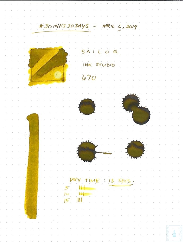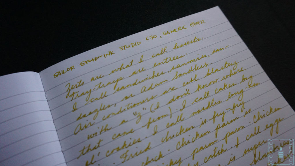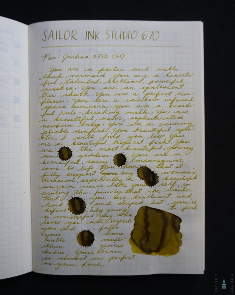 I was expecting this ink to fall more on the gold spectrum rather than this confused mustard color. My experience with the Sailor Ink Studio line is that the color on the label isn’t exactly what you’re going to see on paper – it can be lighter or darker. 670 is definitely a strange ink because it writes in a different shade of yellow when used on other types of paper. It’s strange but doesn’t impress me that much.